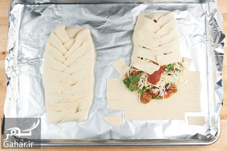 سطحی که می خواهید خمیر را روی آن صاف کنید آرد بزنید سپس خمیر را روی سطح قرار داده و با وردنه صاف کنید. سپس خمیر را روی هم تا کنید و با دست ورز بدهید. اگر خمیر به هم نمی چسبد نگران نشوید آنقدر ورز بدهید و با وردنه صاف کنید تا به هم بچسبد. بعد از این که خمیر نرم و کشدار به دست آمد آن را به دو نیم کنید و با وردنه هر دو را صاف کنید و در اندازه های مستطیل ۶ در ۱۰ دربیاورید.